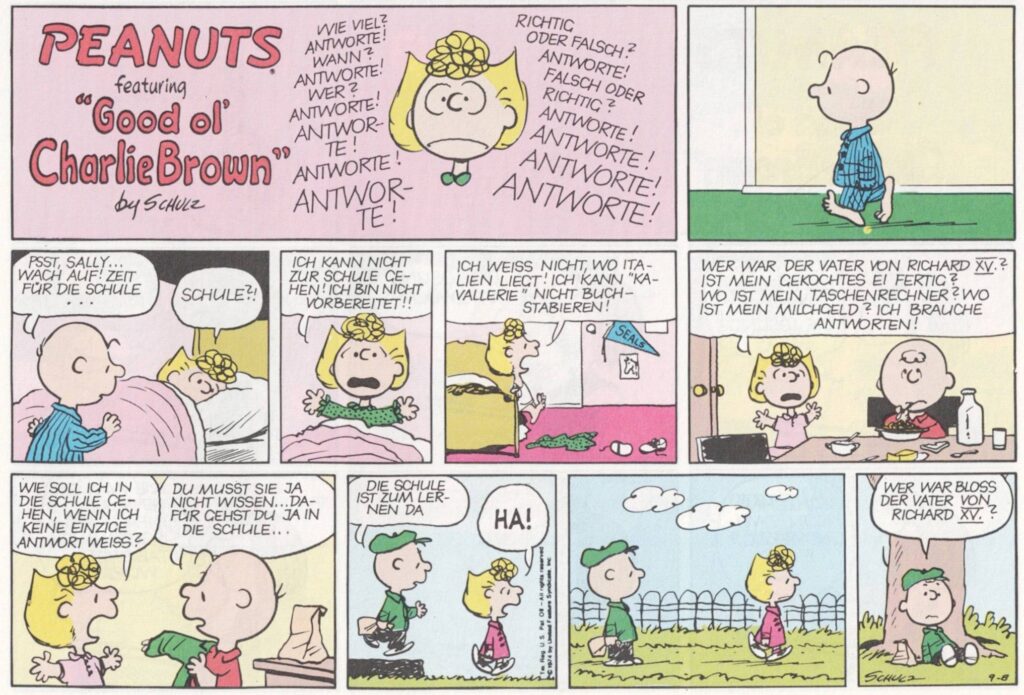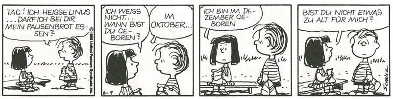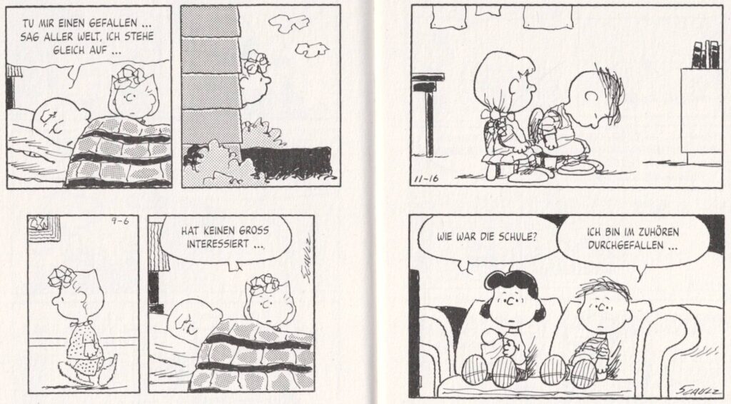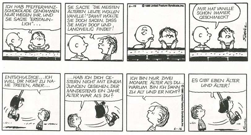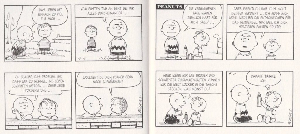 Zwei kleine Geschichten von den Sorgen am Anfang des Lebens. Prost. Aus den frühen Tagen der Charlie Brown Comics und über die frühen Tage seiner Schwester.